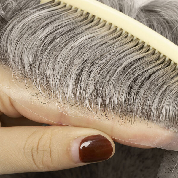 Der vordere 1/2-Zoll-Haaransatz mit V-Loops lässt den vorderen Haaransatz natürlich aussehen und das Toupet simuliert die wahre Haarwuchsrichtung. Es sieht aus wie bei natürlichem Haaransatz