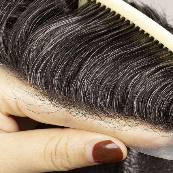 Das STSI Invisible Thin Skin Haarsystem hat einen schönen, natürlichen vorderen Haaransatz. Wir empfehlen jedoch nicht, das Haar nach hinten zu kämmen, da das injizierte Haar auf dünner Haut flach ist und sich nicht leicht zurückkämmen lässt. Wenn Sie Ihr Haar nach vorne tragen, ist es ein wirklich tolles Modell für Sie. Diese unsichtbaren Haarsysteme für dünne Haut lassen sich außerdem leicht anbringen und reinigen.